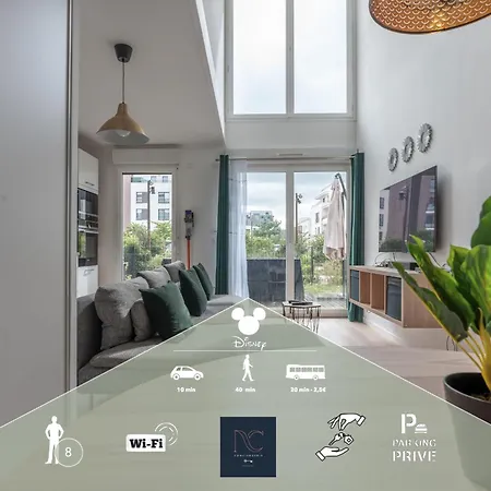 The 85 m^2 Disneyland-Paris 8 Pers, 2 Parking, Wifi features views of the garden and is situated at a distance of 2.5 km from La Vallee Village Outlet Mall. Guests can enhance their relaxation experience at this 2-bedroom apartment with access to an aqua park and a sundeck, providing the epitome of luxury.